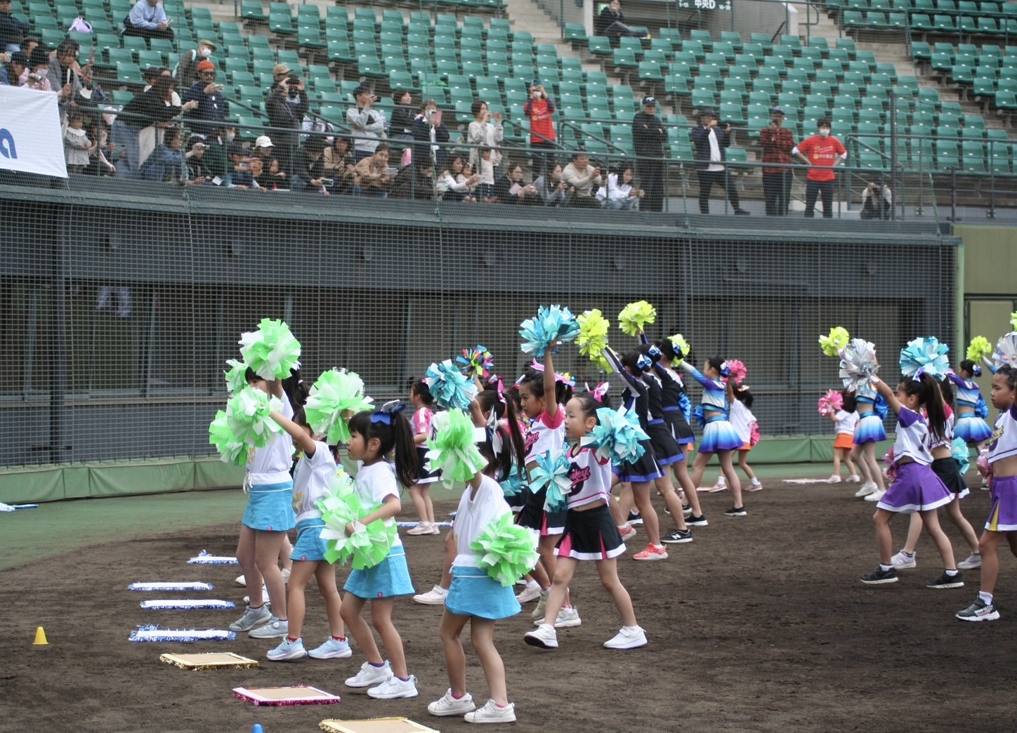 ポンポンを持って踊るPOMダンスとジャンプやキック、アクロバットなど様々な技を音楽に合わせて披露します。